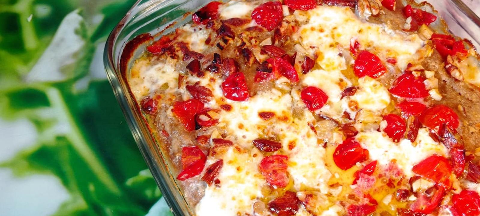 Petites tomate coupĂ©es en deux, fĂȘta, comtĂ©, mozzarella, ail, olives, herbes de provence, noisettes, amande, raisins secs, ...