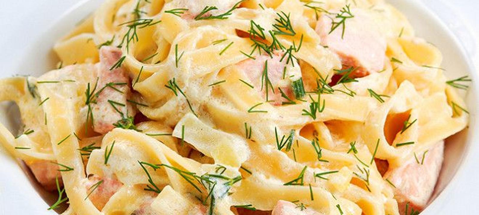 Recouvrir les pâtes de crème puis ajouter le saumon
