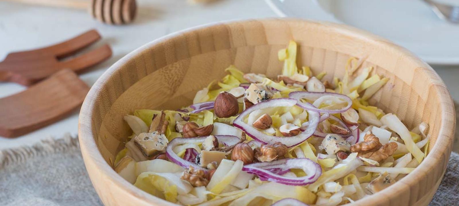 Salade d'endives au gorgonzola, Ă la poire, aux raisins et aux noix